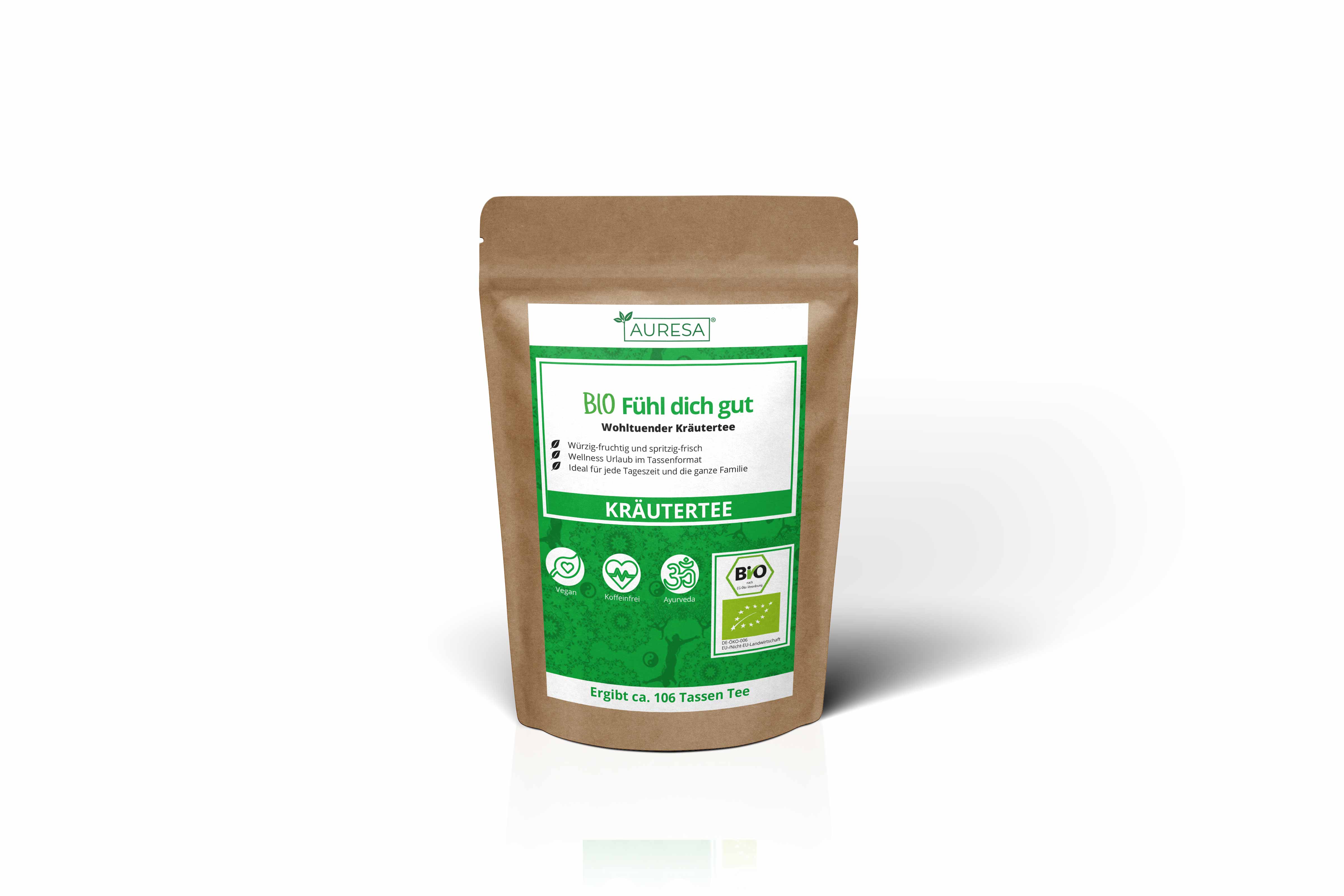 Le thé en vrac est conditionné en trois versions différentes avec différentes quantités de contenu, qui peuvent être consultées sous "Quantité". 1. Doypack (pochette debout) Les sachets debout ont une encoche de déchirure des deux côtés afin que la soudure qui protège le thé puisse être facilement déchirée. De plus, tous les doypacks sont équipés d'un verrou à pression refermable. Les sachets debout sont sans danger pour les aliments, stables, inodores et insipides. 2. verre Bocaux de stockage de haute qualité avec fermetures en liège pour un stockage et un remplissage protégés. Les verres à thé sont hygiéniques, faciles d'entretien et lavables au lave-vaisselle et ont un diamètre de 70 mm (zone de remplissage Ø 39 mm) et une hauteur de 130 mm. 3. Sac tubulaire La quantité vendue 1000g est envoyée dans un sac tubulaire non refermable.