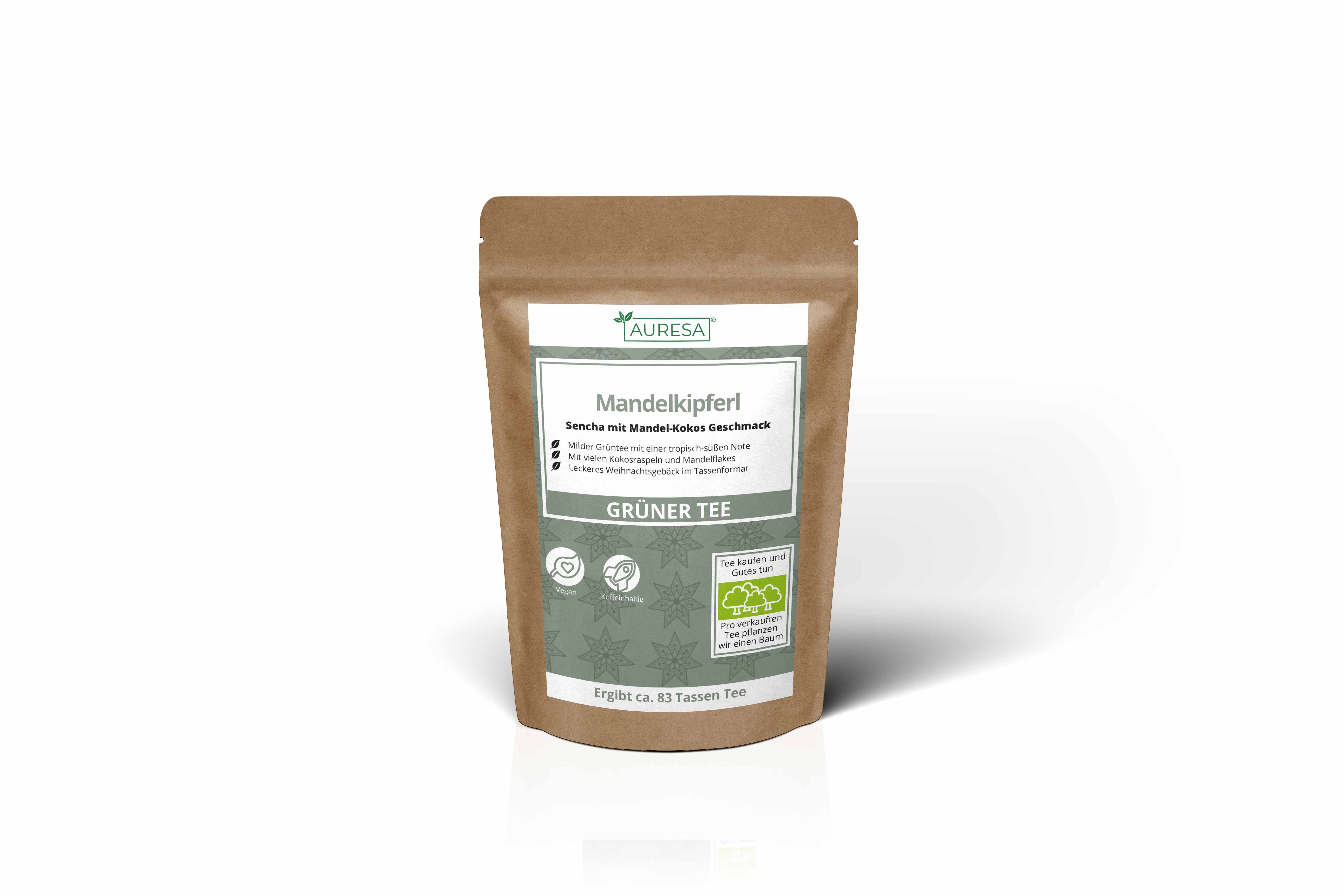 Grüner Tee China Sencha, Kokosraspeln(25%), Aroma, Mandelflakes(1,7%)Préparation du thé