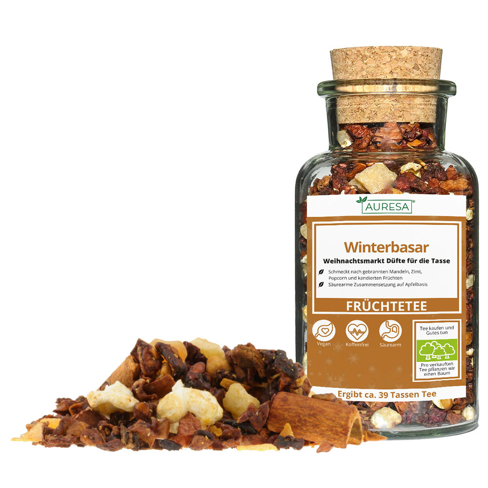 Der Tee riecht unglaublich lecker nach Weihnachtsmarkt und gebrannten Mandel. Die Farbe ist mittelrot. Der Geschmack ist leicht zimtig, süßlich, etwas cremig und natürlich, insgesamt säurearm. Es ist der Lieblingstee meiner Familie und eine gute Alternative zu überzuckerten Punschvarianten. Wir erwärmen auch Apfelsaft und „würzen“ mit diesem Tee. Ich hab ihn schon nachgekauft und kann ihn weiterempfehlen.